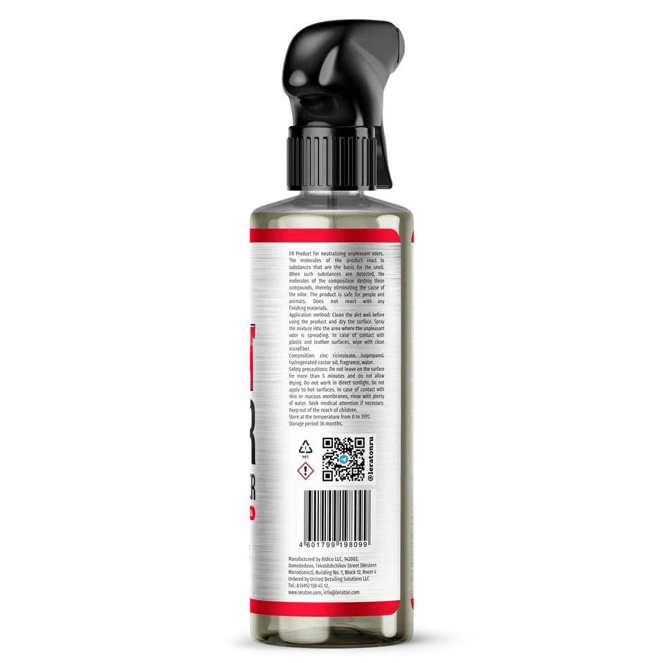 Состав для нейтрализации неприятных запахов. Молекулы продукта реагируют на вещества, которые являются основой нежелательных испарений. При обнаружении таких веществ молекулы уничтожают эти соединения, полностью устраняя остатки неприятного запаха. Безопасен для людей и животных. Не вступает в реакцию с любыми материалами отделки.