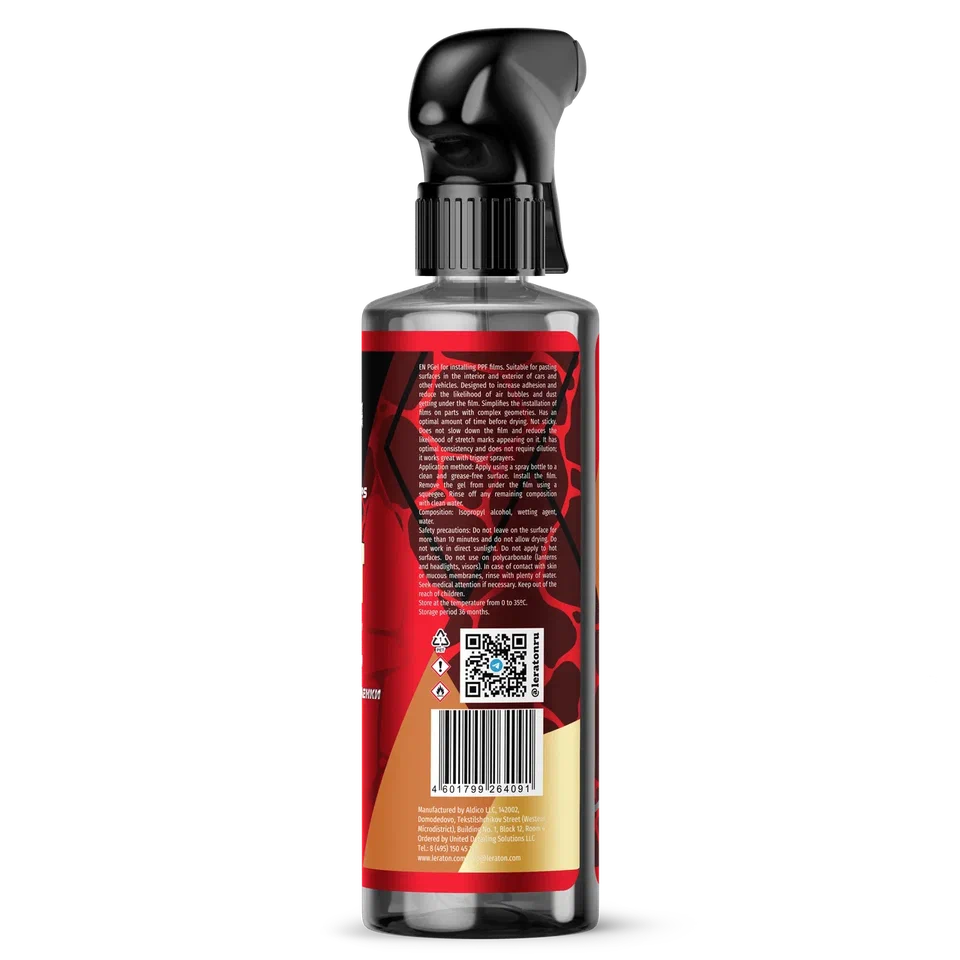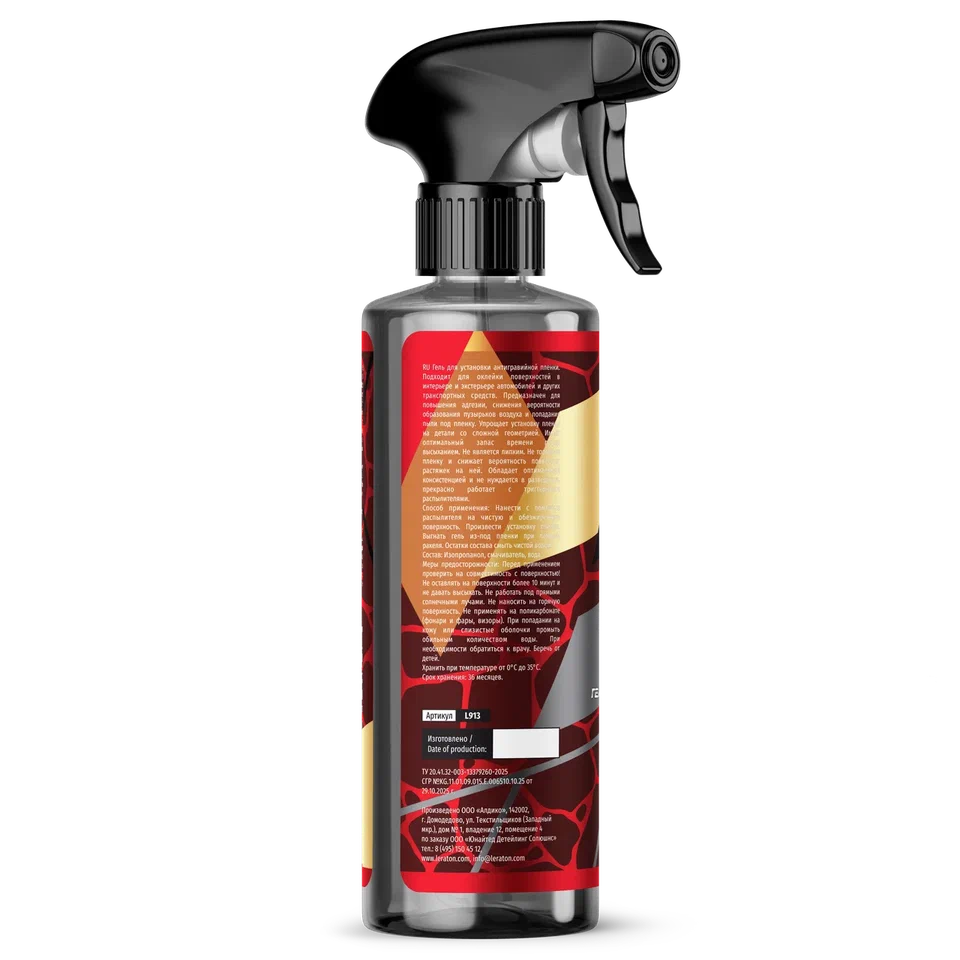 Способ применения: Нанести с помощью распылителя на чистую и обезжиренную поверхность. Произвести установку пленки. Выгнать гель из-под пленки при помощи ракеля. Остатки состава смыть чистой водой.
