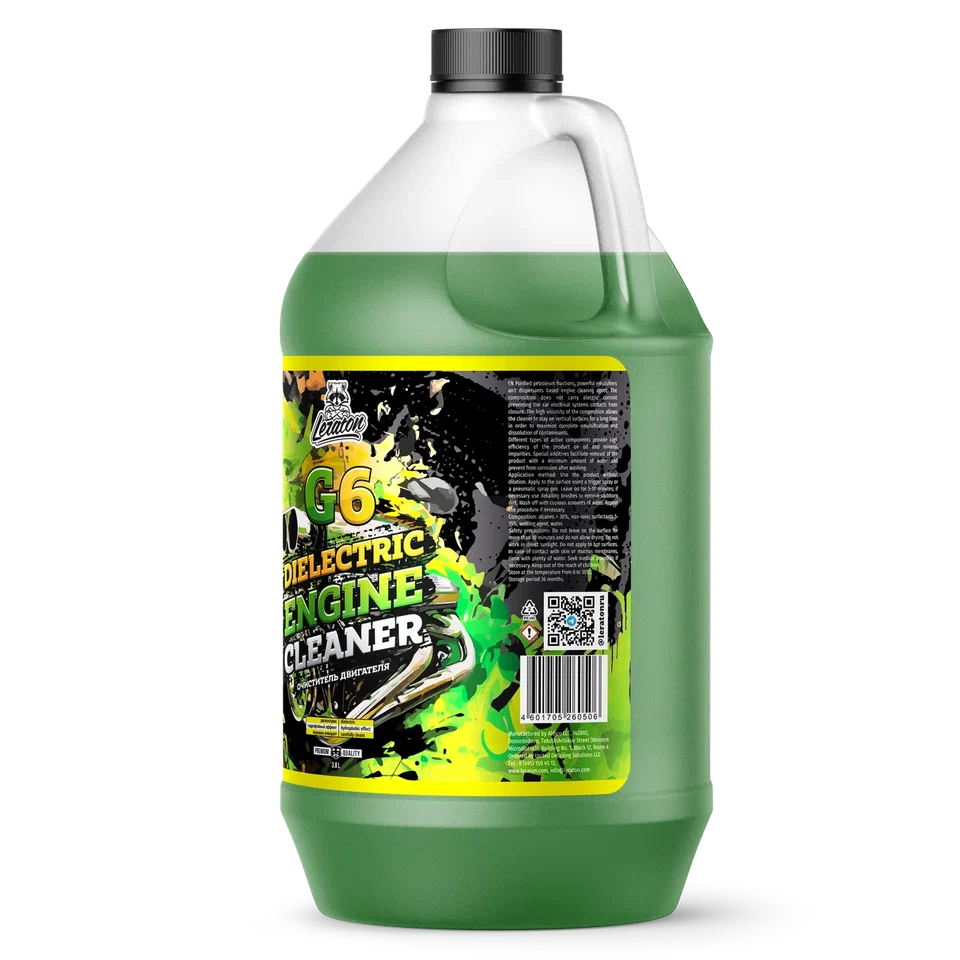 Средство для очистки двигателя на основе очищенных нефтяных фракций, мощных эмульгаторов и диспергаторов. Состав не проводит электрический ток, что исключает замыкание контактов электрических систем автомобиля. Высокая вязкость состава позволяет средству долго удерживаться на вертикальных поверхностях с целью максимально полного эмульгирования и растворения загрязнений. Различные типы активных компонентов обеспечивают высокую эффективность очистителя на масляных и минеральных загрязнениях. Специальные добавки позволяют удалить средство минимальным количеством воды и предотвращают образование коррозии после мойки.