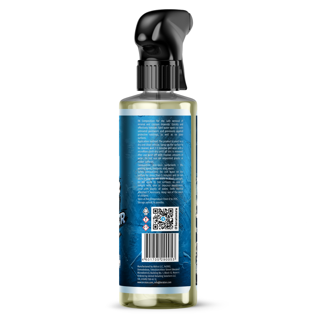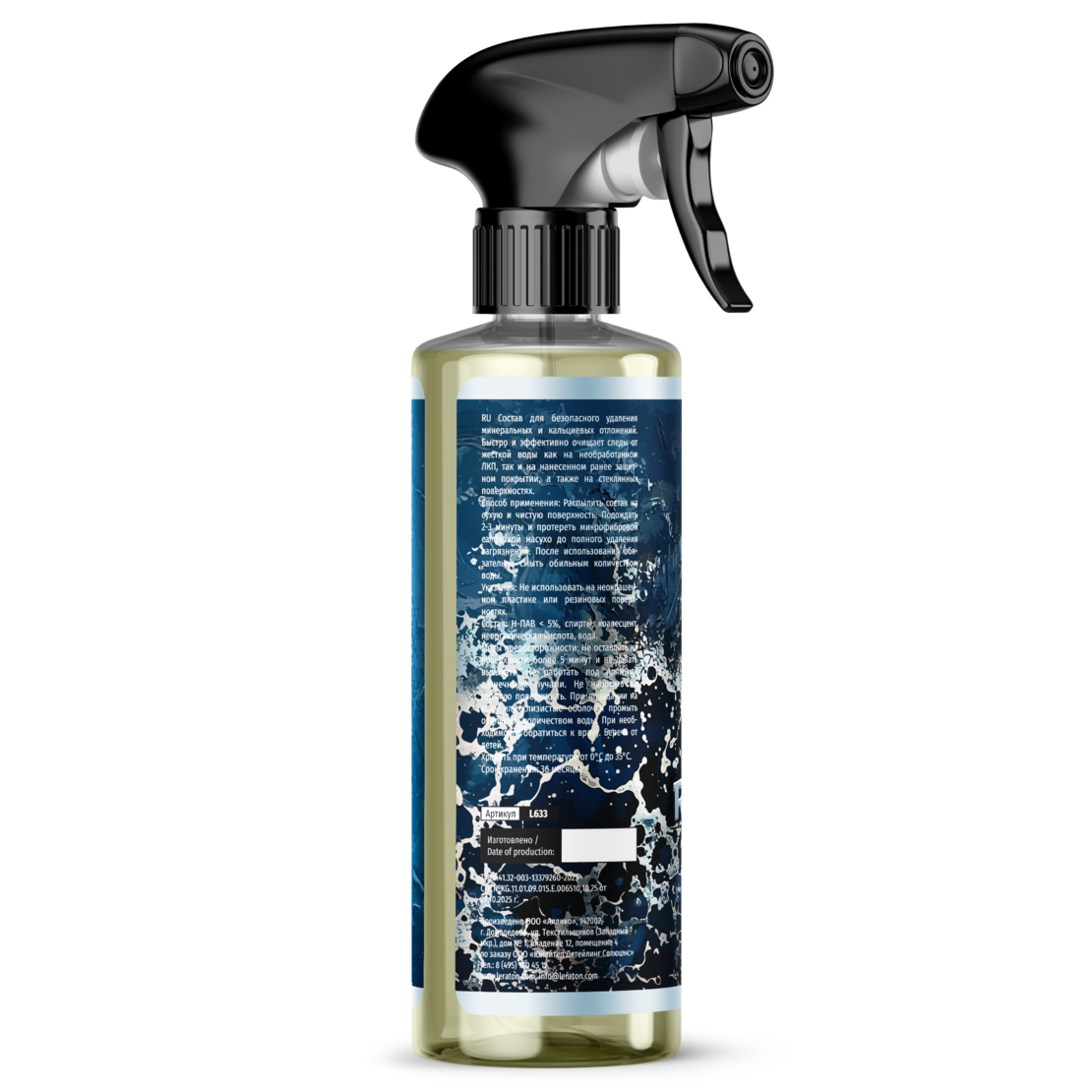 Состав для безопасного удаления минеральных и кальциевых отложений. Быстро и эффективно очищает следы от жесткой воды как на необработанном лакокрасочном покрытии, так и на нанесенном ранее защитном покрытии, а также на стеклянных поверхностях.