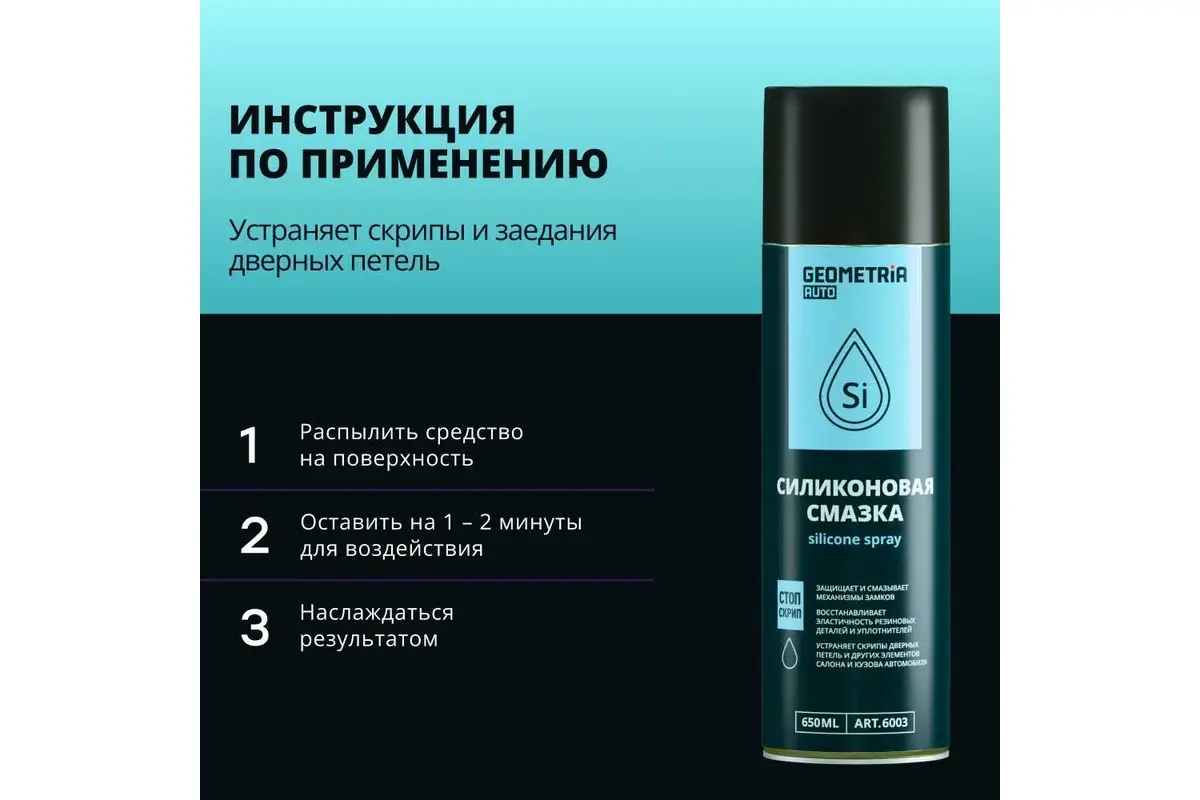 Продлевает срок службы резиновых уплотнителей и предотвращает их примерзание в зимнее время. Восстанавливает эластичность резиновых деталей и уплотнений, предохраняя от старения. Устраняет скрипы дверных петель, трущихся пластиковых элементов салона и кузова автомобиля. Защищает и смазывает механизмы замков. Применяется для повышения электроизоляционных свойств высоковольтных проводов.